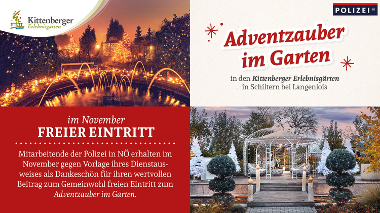Freier Eintritt im Kittenberger Adventzauber für Mitarbeitende der Landespolizeidirektion Niederösterreich gegen Vorlage eines Mitarbeiterausweises/Dienstausweises bei der Eintrittskassa, als kleines Dankeschön für den wertvollen Beitrag zum Gemeinwohl!