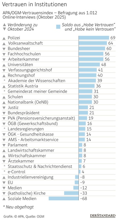 Wie schon in den vergangenen Jahren findet sich die Polizei wieder im Spitzenfeld (Plätze 1-3) des APA-OGM Vertrauensindex. Dieses Jahr wieder klar an der Spitze vor der Volksanwaltschaft und dem Bundesheer.